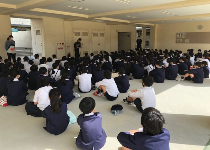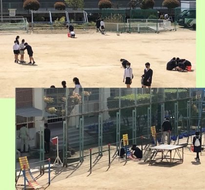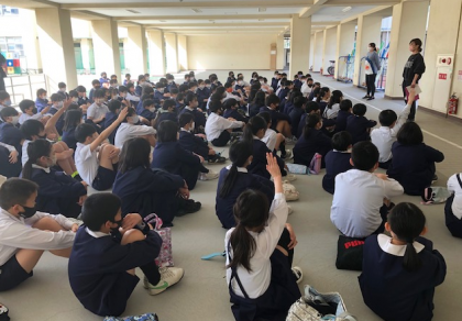 ピロティに集まり、先生からの指示を受けて、校舎等のお掃除にかかりました。