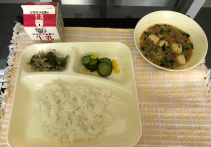 ちなみに今日の献立は、麻婆豆腐、もやしとピーマンのゴマ炒め、キュウリとコーンの甘酢和え、ごはん、牛乳です。