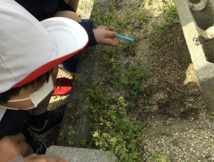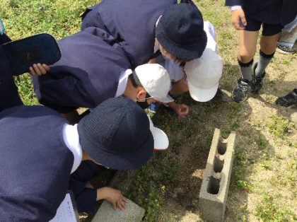 4年生の理科の時間です。学校の中を探検して、身近にいる春の生き物や植物にはどんなものがある(いる)かを調べました。