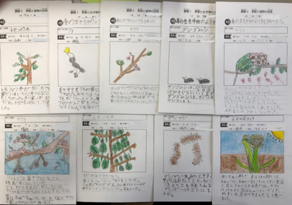 水曜日に調べたことを、今日は観察カードにまとめました。いろんな植物、虫たちが登場していました。