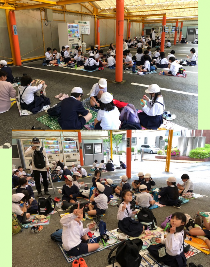 見学を終えた子どもたちは、屋根のある広場でお弁当タイムです。