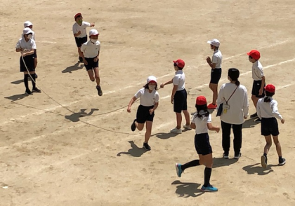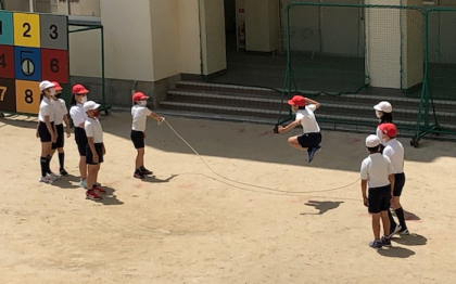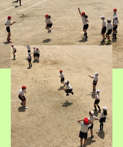 見るとみんなで大縄跳びをしています。5年1組と2組の子どもたちです。