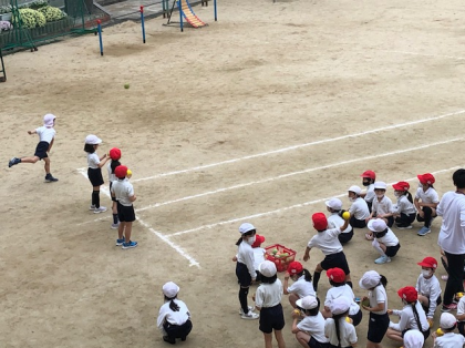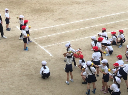2年2組と3組の子どもたちが、50m走のラインに立って、ボール投げをしています。