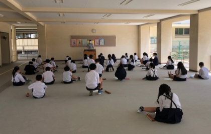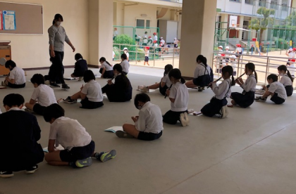 3時間目。ピロティから笛の音が流れてきました。4年3組の音楽の時間。聞きなれたコマーシャルソングです。