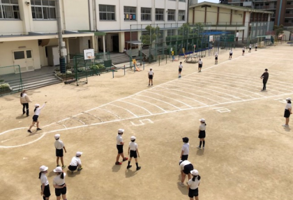 3時間目の運動場。今日は、5年生がソフトボール投げをしています。