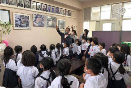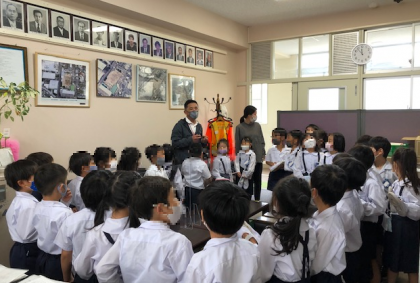 4時間目、1年生が学校の各部屋を探検です。校長室にもおじゃましました。