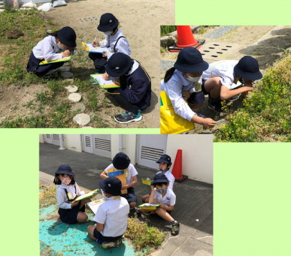 虫メガネを片手に、観察ボードを下げて、春の生き物を探しています。