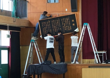 これまで、教職員が何日もかけて職員作業で整理をしてきました。トラックへの運搬は業者が行いましたが、大きなトラックが2往復するだけの量です。壁にかけてあった校歌の歌詞の額も取り外しました。