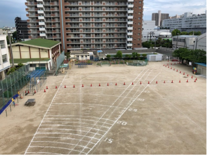そして今日は、工事業者が、運動場にできるフェンスのところに、しるしを置く日でもありました。運動場が真っ二つです。