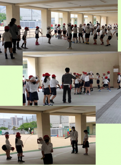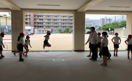 2時間目のピロティ。3年2組と3組は体育の学習の時間です。