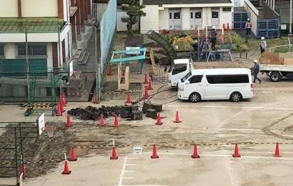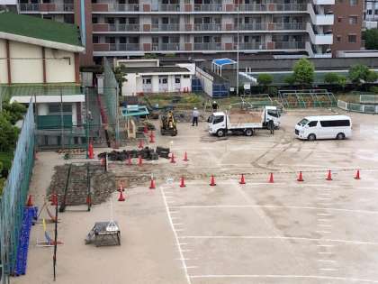 本校体育館のそばにある運動場の南東一帯の遊具エリア。雨で順延になっていましたが、今日、ついに遊具撤去の工事が行われました。
