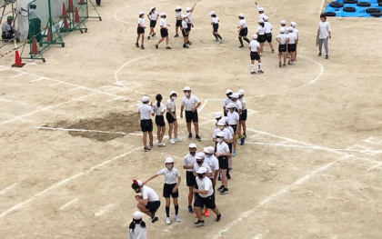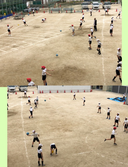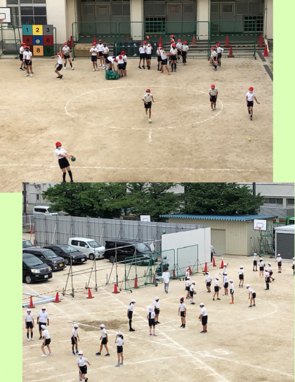 5時間目は6年1組2組、6時間目は6年3組4組が、半分になった運動場で体育の学習です。