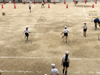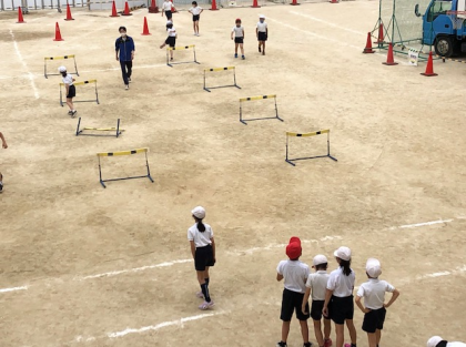 4時間目。4年1組、2組が運動場いっぱいに広がって、ハードルをしました。