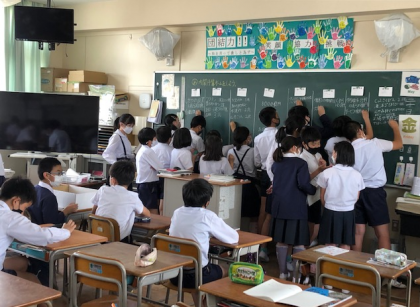6年2組の6時間目の社会の時間。模擬の予算委員会開催です。子どもたちはこの時間の前に自分の担当の省庁の要求額を考えました。具体的に、何をするからいくらいる、という根拠をもって、それをこの時間、黒板に貼っていきました。