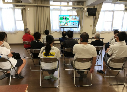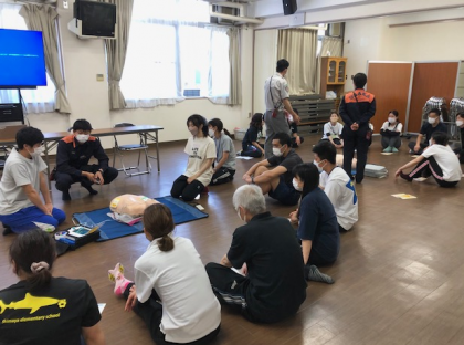 放課後、多目的室で職員が「救命救急講習」を受けました。