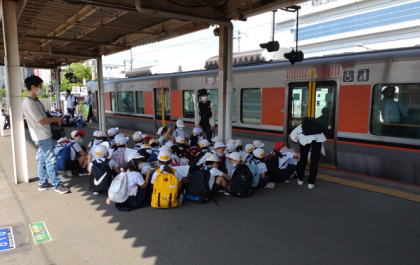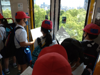 その間、電車の窓から見える町の様子をみて、違いを比べたり、印象に残る景色を見定めたり、子どもたちは、電車の中で活動です。