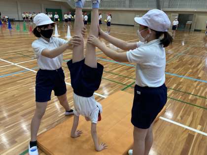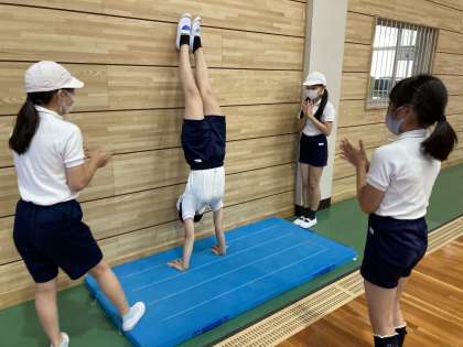 ピカピカの体育館で今日学習したのは倒立です。