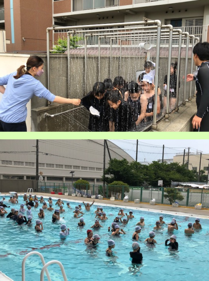 雲り空で、気温も高くない中、最初のシャワーで思わず声があがる子どもたち。準備体操ののち、順にプールに入りました。