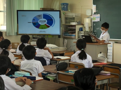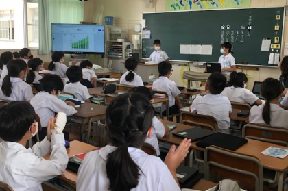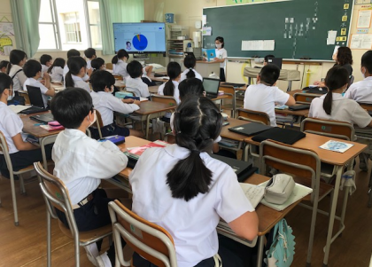 この時間は国語の学習の時間です。「環境問題について報告しよう」を教材に、説明文の書き方を学んだ子どもたちは、「地球温暖化」や「外来種の増加」など、環境問題に関するテーマを自分で決めて、調べ学習をしたそうです。