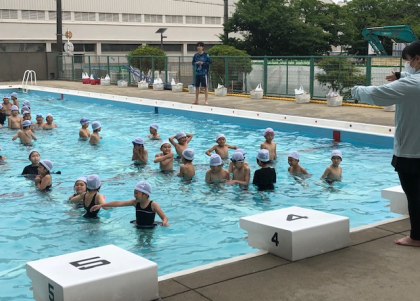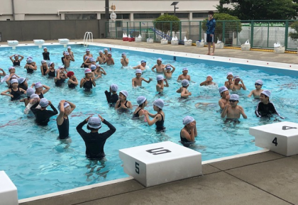 4年生の子どもたちは、1年生の時に学習して以来のプールになります。先生の動きと同じ動きをプールの中でする子どもたち。先生は、「こんなことも、できてましたよねー?」と、プールの床にお尻をつけること、大の字になって浮いてみることなど、やってみるように促します。