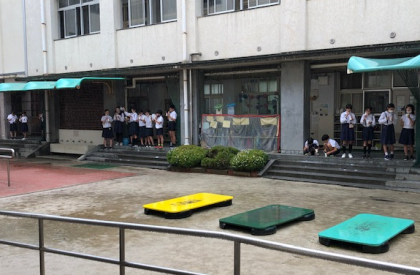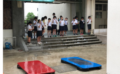 雨の降る中庭に向かって、一斉にシャボンの液を付けたストローを吹いています。