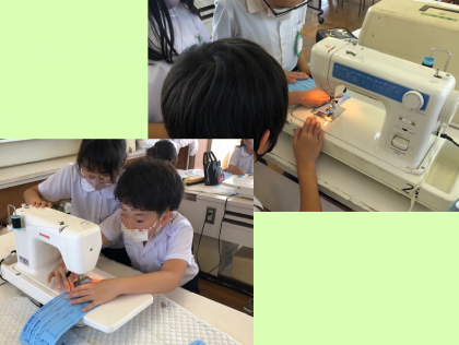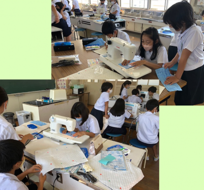 1時間目。5年2組が家庭科室でミシンの練習です。