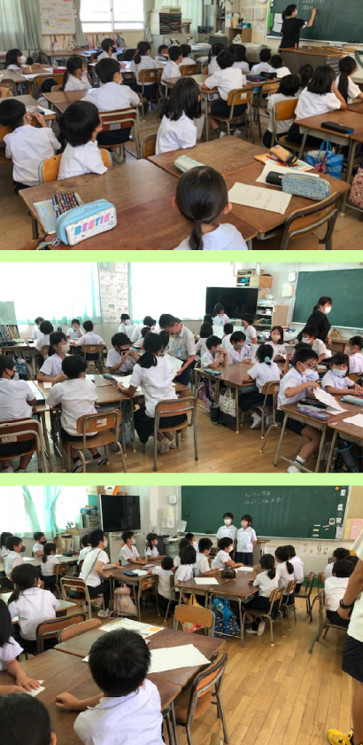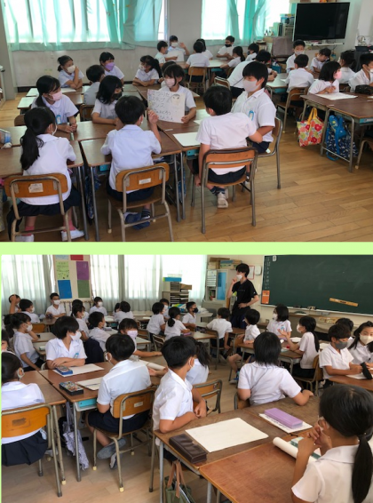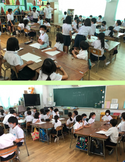 4年生が2年生の教室に、2年生が4年生の教室にと、半分ずつ程に別れ、それぞれの教室で活動しました。班に分かれて4年生が自分の名前の文字一つ一つを頭にした作文をして2年生に自己紹介。それを覚えてくれたかな、とクイズにしたり、2年生からも自分の名前を紹介したり。