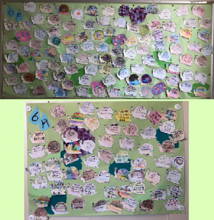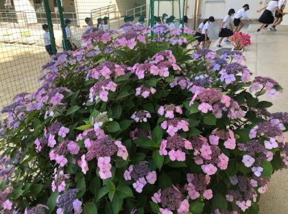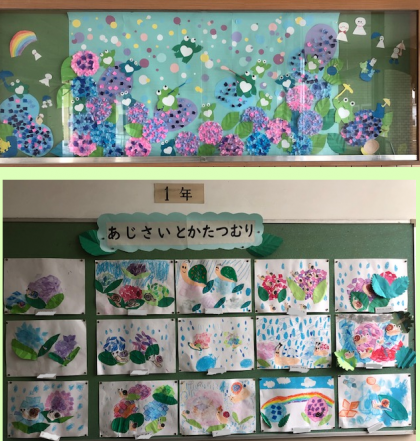 見事に咲くガクアジサイ。本校玄関の4年生が制作したアジサイとカエルたち。1年生の作品で「アジサイとカタツムリ」。そしてカタツムリを台紙に6月の目標を書いた6年生の子どもたちの掲示物です。