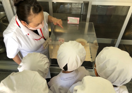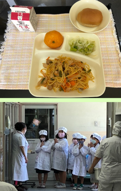 給食室に取りに来た子どもたちは、手を合わせて「いただきます!」と言ってから、いそいそと調理員さんのところへ食缶や食器を受け取りに行きます。