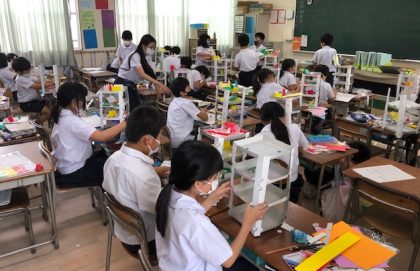 子どもたちの机の上には、大きな白い塔があります。こらは、ビー玉を上から転がして遊ぶ「コロコロガーレ」という作品とのこと。段ボールや色画用紙を張り合わせてビー玉の通り道をつくっています。