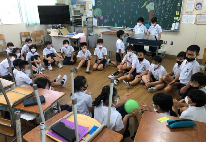 子どもたちが輪になって座り込んでいます。教室の前では、二人の女の子が軽快な音楽をオルガンで奏でています。ボール運びのゲームかな。