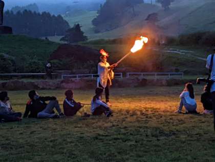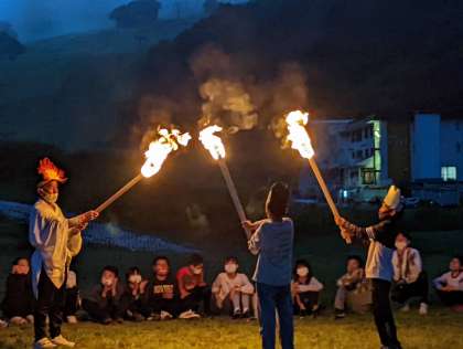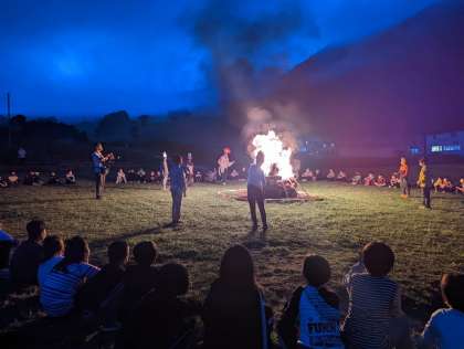 日も落ちて、いよいよ大きな行事であるキャンプファイヤーです。鉢伏山から火の神が登場し、火の子に協力・友情・感謝の3つの火を授け、真ん中のトーチに大きな火が灯りました。