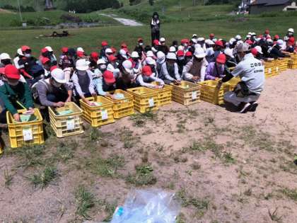 宿舎のスタッフの方から、飯ごう炊さんの材料・器材を受け取って、火の起こし方や米の炊き方など、カレーライス作りについて、教わりました。今から場所を移動していきます。