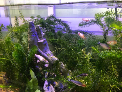 青い光と乳白色の光の2種類のライトがあてられていて、中の藻もとても元気にしています。