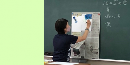 夜の空の色はどんな色に見えるかな。パレットで作った色を絵筆につけて、少し、塗ってみます。