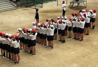 6年生の器械体操。今日は音楽に合わせて、並んだ列の前から順に動く練習のようです。