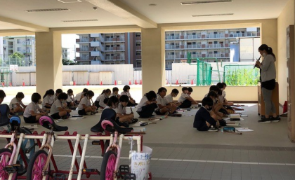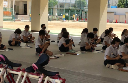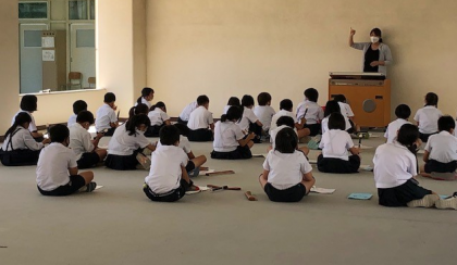 3時間目。笛の音が、いつもよりはっきり大きく聞こえてきます。4年2組の子どもたちが、ピロティで音楽の学習をしていました。