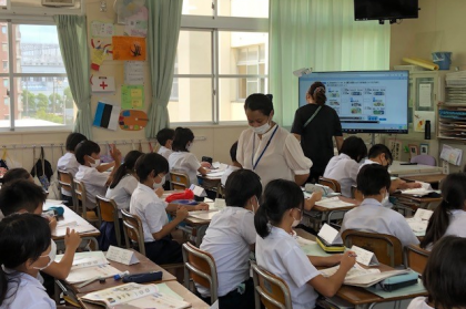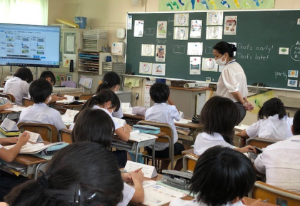モニターの画面や黒板に貼られるカードそして机上のテキストで、子どもたちは、聞いて、発音し、質問され、答えてを繰り返します。
