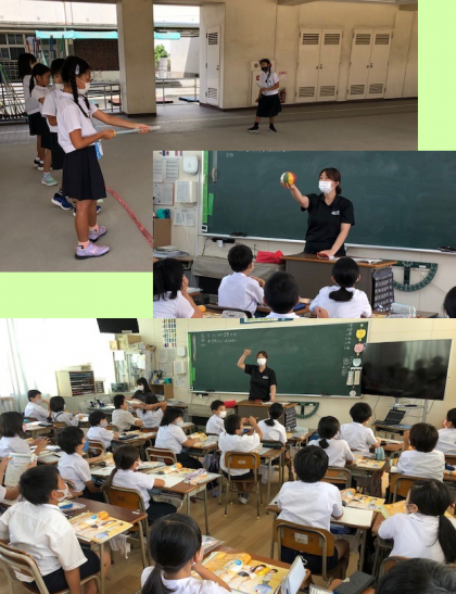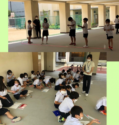 3時間目の終盤、ピロティから「ポン」「ポン」と音が聞こえてきます。3年4組の子どもたちが順に、勢いよく空気てっぽうを打っていました。
