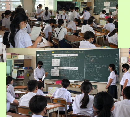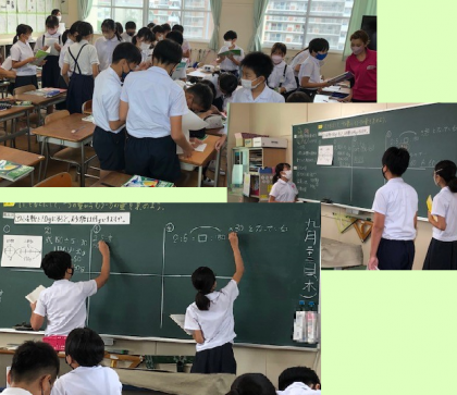 問題に対し、どのように考え求めていくか、子どもたちは考え、その考え方の交流をしてから、何人かが黒板に自分の求め方で板書していきます。