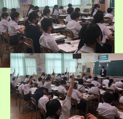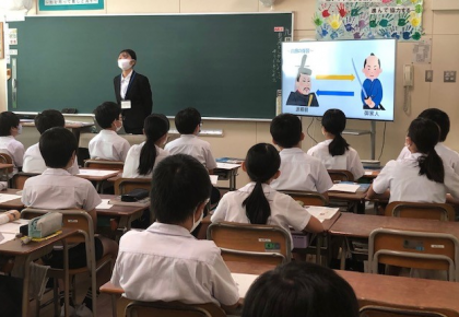 6年4組の教室です。3時間目の社会科の時間は教育実習生の授業です。