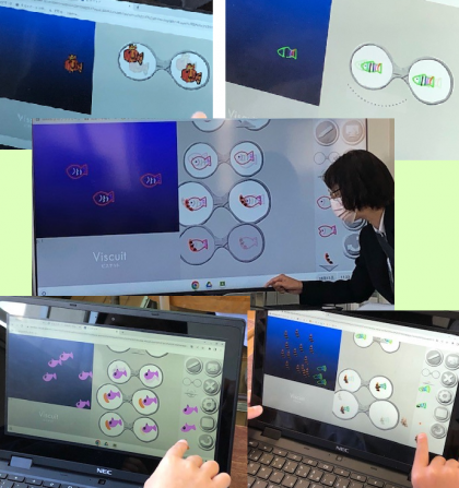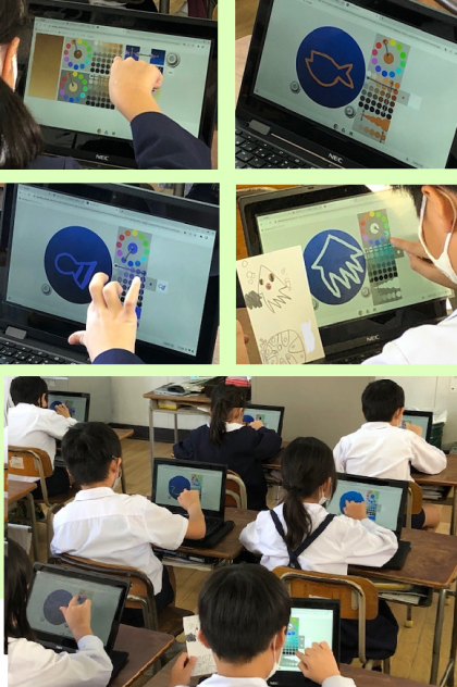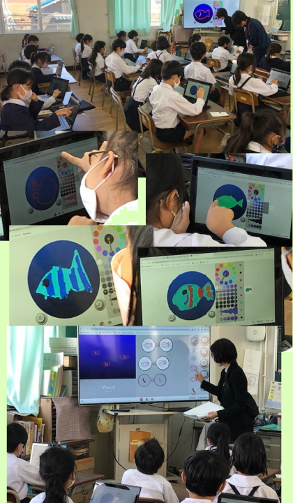 パソコンを前に子どもたちはまず、海の色ってどんな色かなと、色を選ぶこと指定することを教えてもらいます。次は、一度カードに描いてみたお魚を、パソコン上で描くことを学びます。