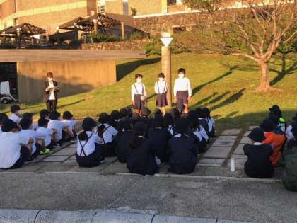 係の子の進行で朝の集いが行われました。学校長の話のあと、今日の大まかな予定を聞き、朝の体操をして、お月様が出ていたので、理科の学習をしました。