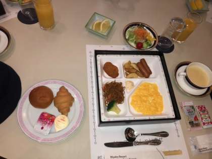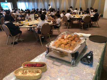 今朝はパンです。白身のフライや焼きそばが出ました。