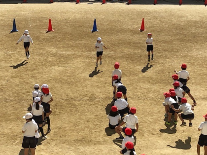 速さを競うけれど、子どもたちの表情は、ニコニコ顔です。秋の穏やかな光の下でキラキラ、生き生き、競争を楽しむ子どもたちでした。