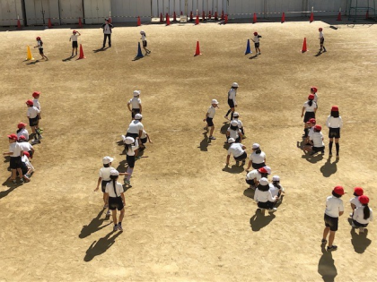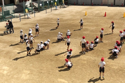 3時間目。2年1組の子どもたちが運動場に広がって、体育の学習です。