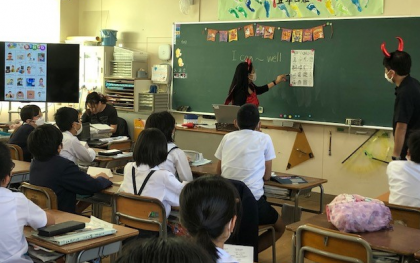 ハロウィンが近いこともあって、C−netの先生と英語の先生が、仮装をして教室に入ると子どもたちは大盛り上がりです。