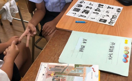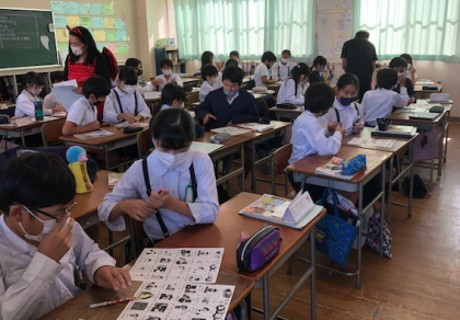 今日は、二人でじゃんけんをして、プリントにある好きな個所を英語で話し、ビンゴになるとあがり、というゲームをしました。