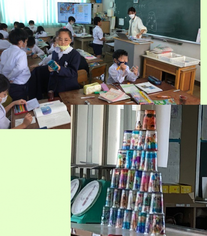 「島屋小学校の思い出」と題し、透明プラスチックのコップに、油性マジックで思い思いの絵を描きます。それを組み立てて、「プラスチックコップ ピラミッド」を作ろうという取り組みです。