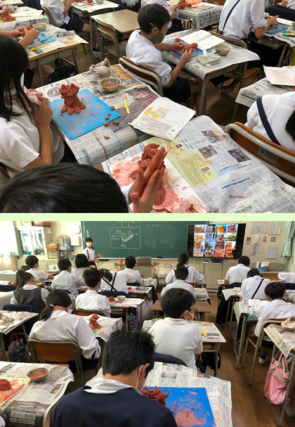 粘土をこねるのは、久しぶりかな。子どもたちは、手をレンガ色に染めて一心に取り組みます。